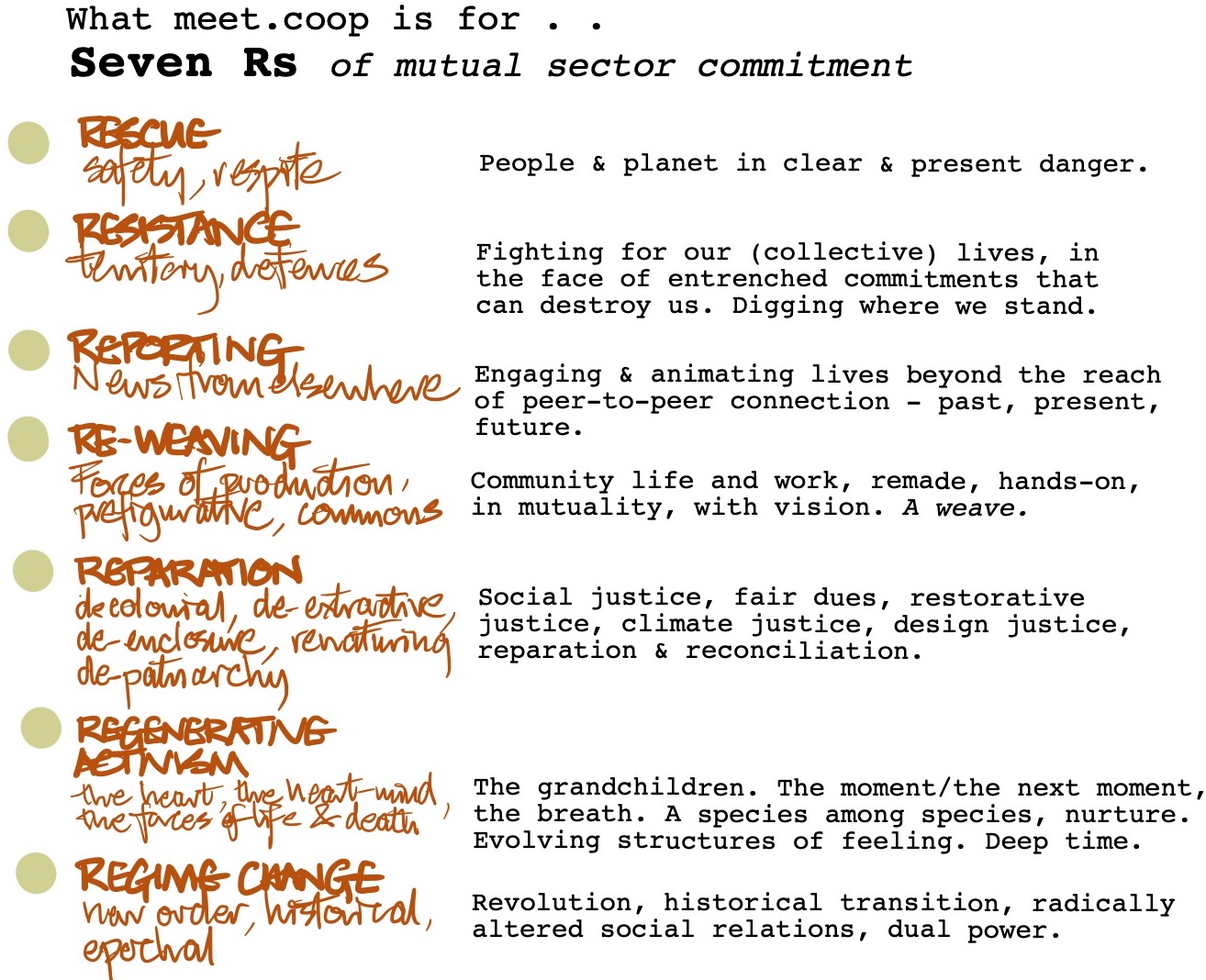 In meet.coop - simply because the question of 'what is it all for?' is so complex - we had a hack on what civil society is/does. We called it the 'Seven Rs of activist commitment'. A schema is below and in due course a page will be here too. Seven Rs