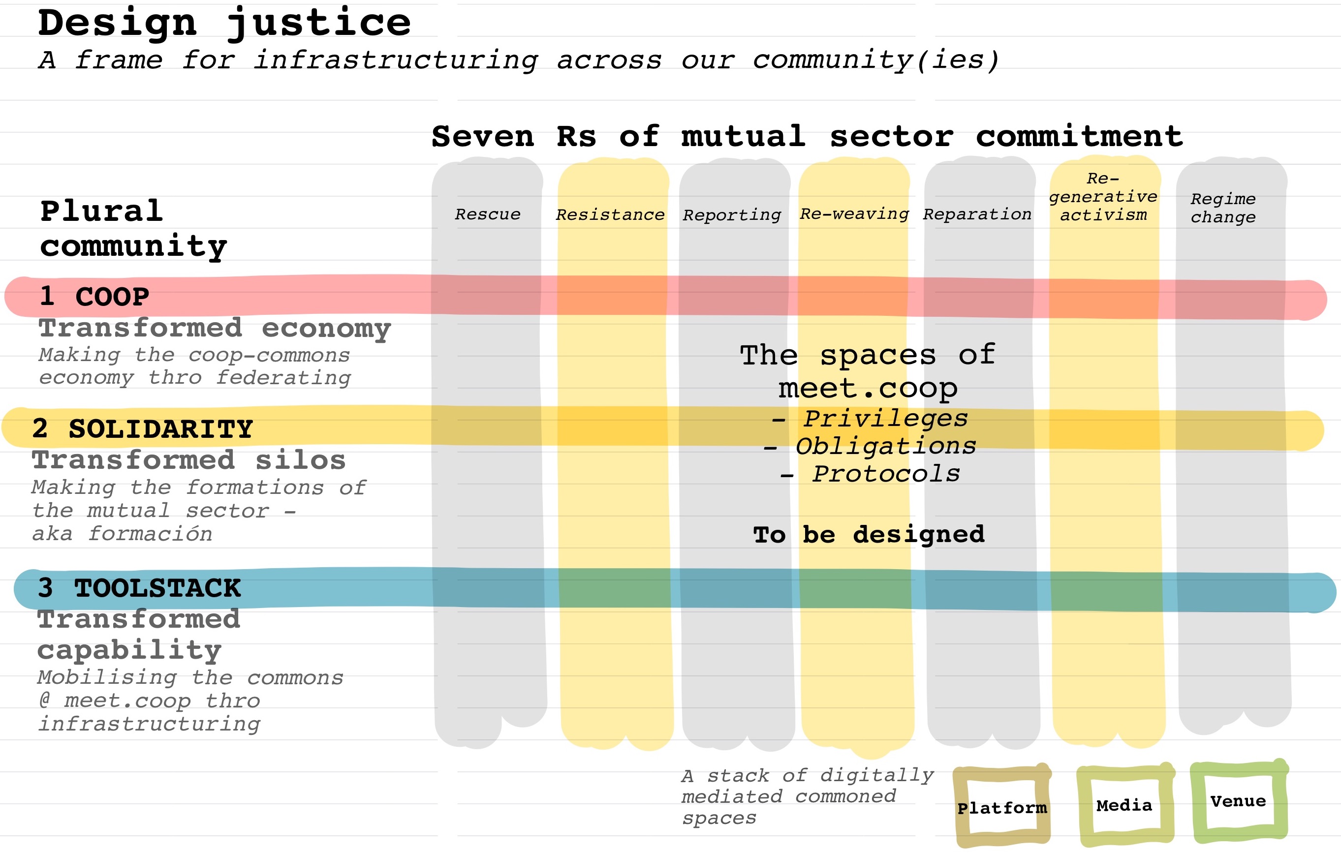 The seven Rs can be taken together with the sectors of the Community layer (the membership of the digital commons) to create a matrix within which matters of design justice can be systematically explored. See the schema below. Design justice
