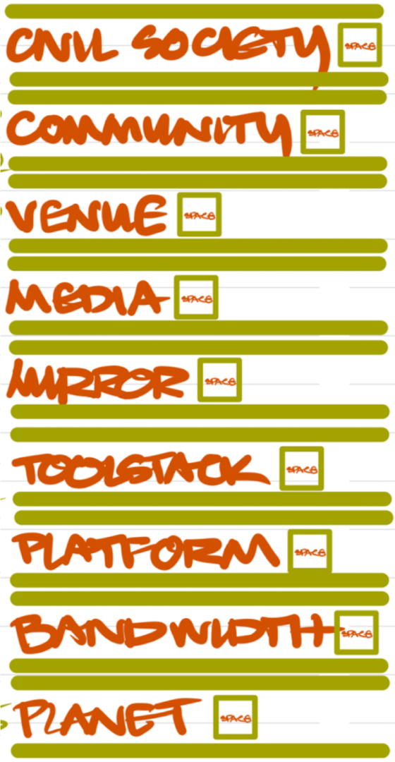 For our purposes in the Fund and in the associated Federation, we'll work with a schema of nine kinds of digitally mediated space, organised in 'a stack'. It has three segments: a 'tech' sub-stack in the middle, with a 'planet' substack below and a 'social' sub-stack above. A real full stack
